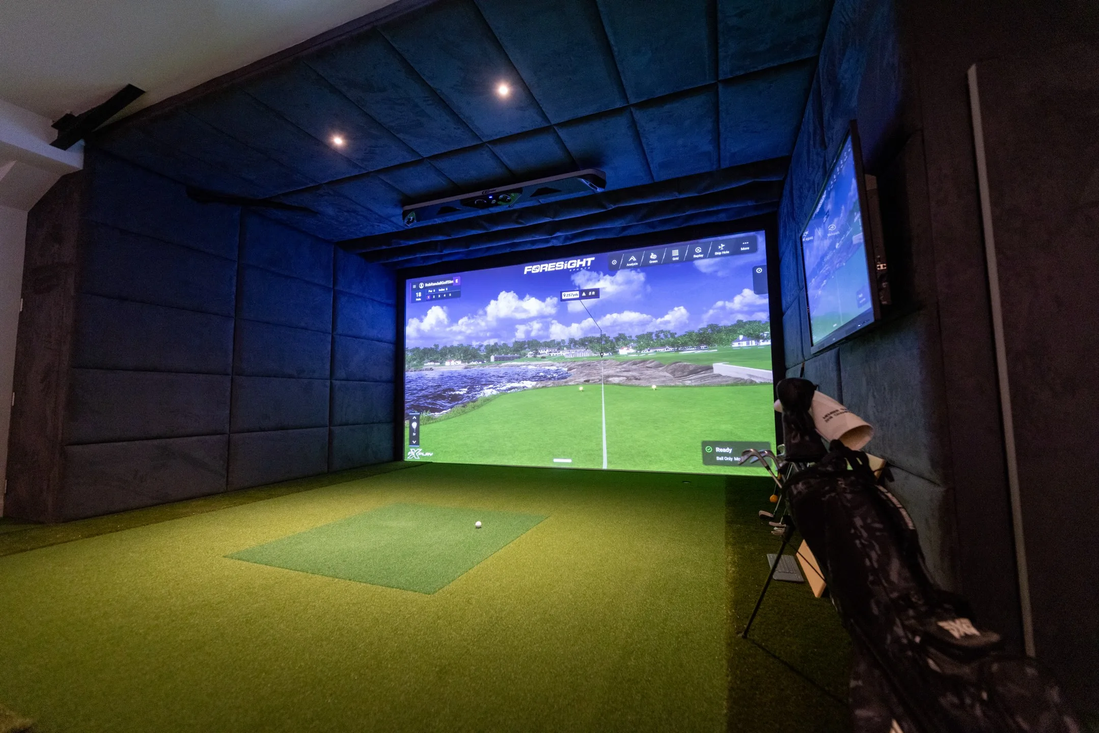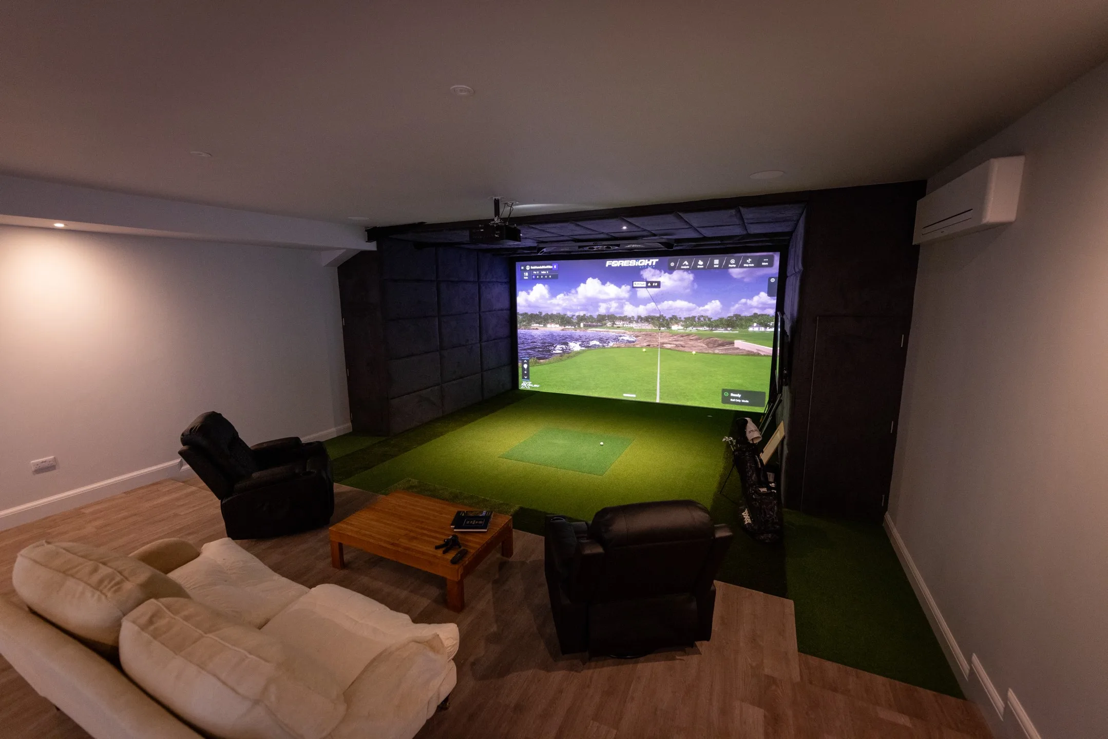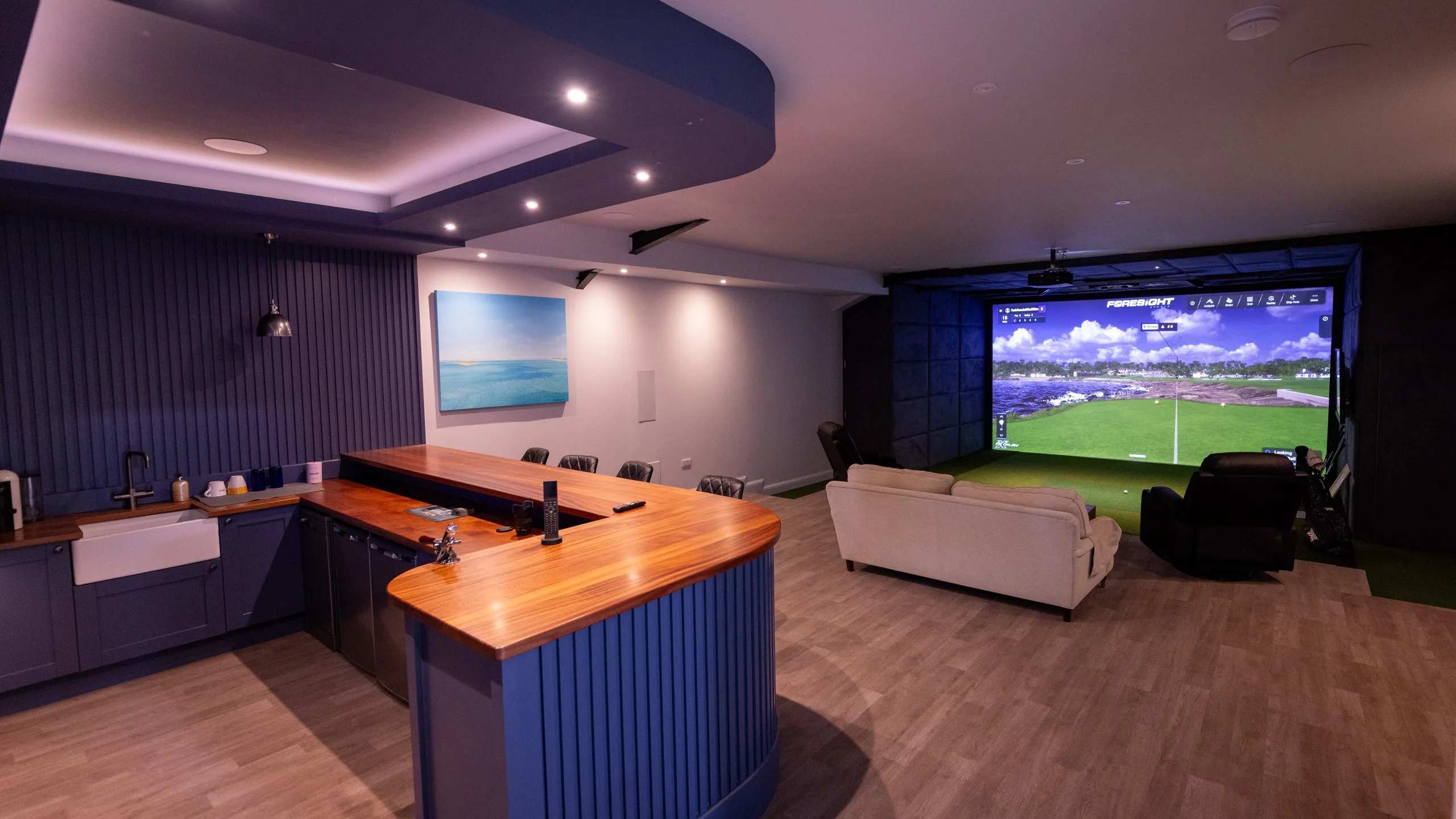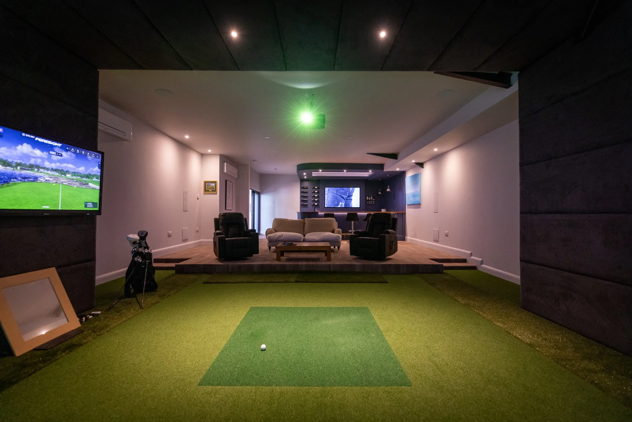 Our client built a designated outbuilding for his Foresight Sports simulator for year-round practice. The building houses a 16:9 sim with a GCHawk overhead launch monitor, FSX Play software, along with a stylish bar at the rear, making it an ideal space to practice, play and socialise.