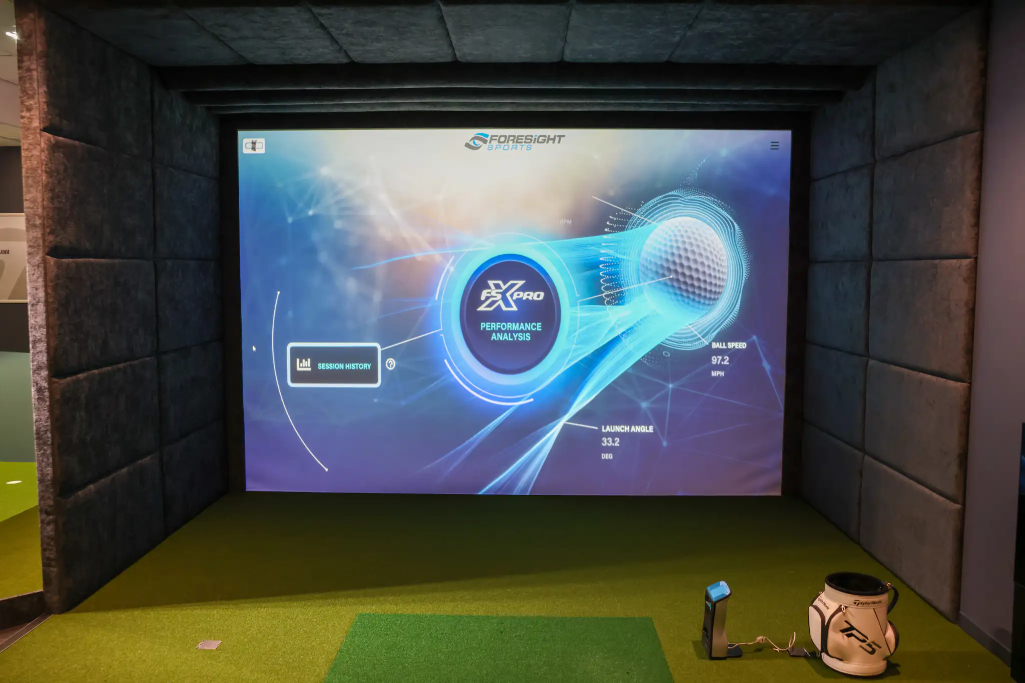 Foresight Sports Europe are the launch monitor and simulator of choice for the project. They designed and installed a custom 16:10 simulator, complete with fully upholstered panels on the walls and ceiling to provide a luxury finish. The GCQuad, the most-used launch monitor in the industry, will deliver unmatched precision and directly measured ball and club data, to ensure accuracy in every session.
